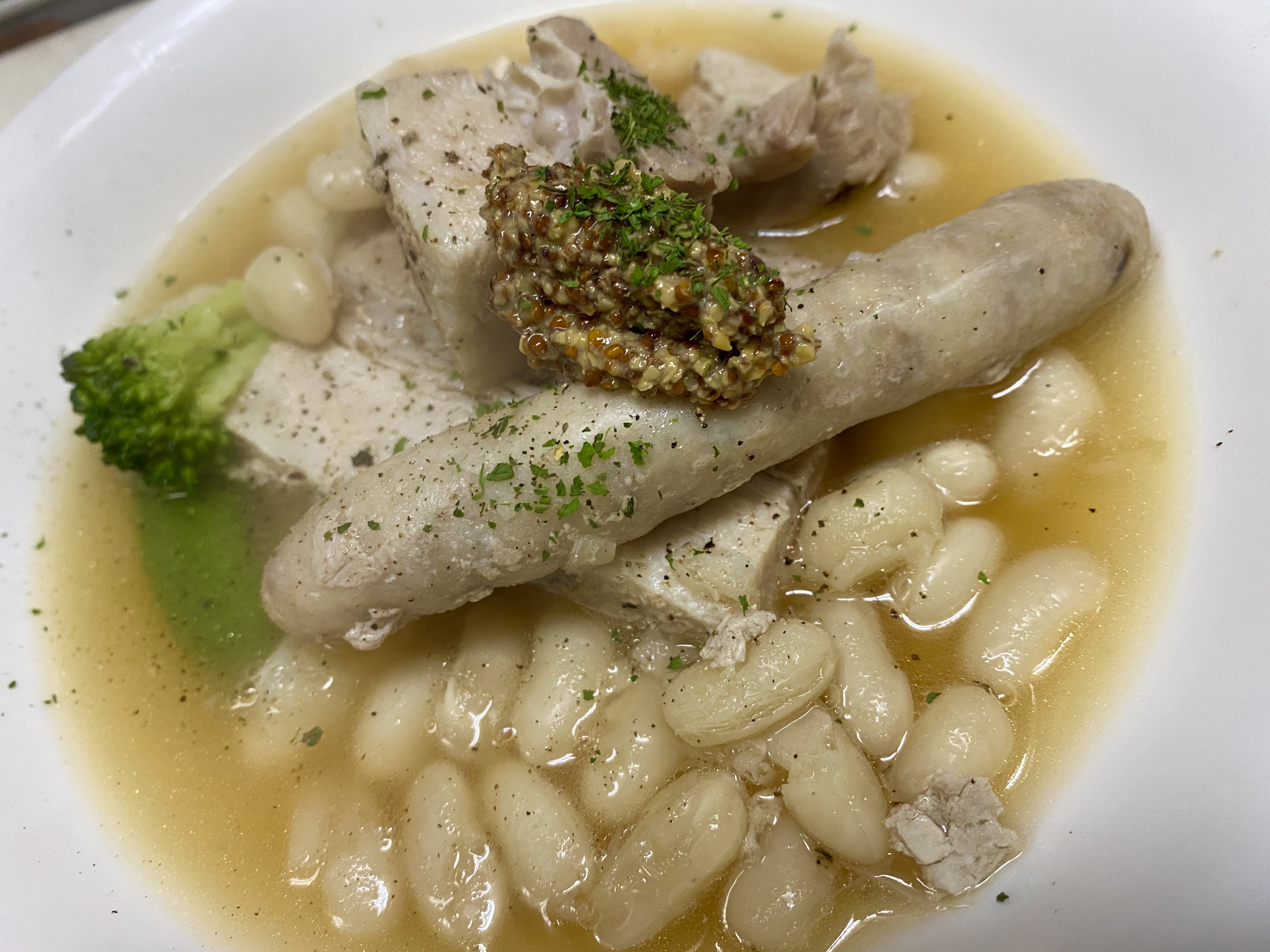 豚、ソーセージ、白インゲン豆のブレゼでございます〜🐷